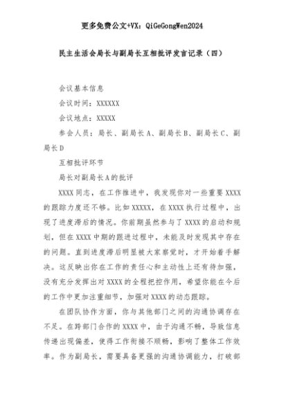 【七哥公文】2025年:民主生活会局长与副局长互相批评发言记录(四)+更多免费公文+VX:QiGeGongWen2024+更多免费公文+VX:QiGeGongWen2024