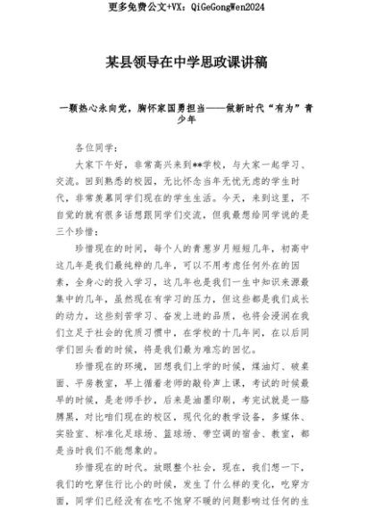 【七哥公文】2025年:某县领导在中学思政课讲稿+更多免费公文+VX:QiGeGongWen2024+更多免费公文+VX:QiGeGongWen2024