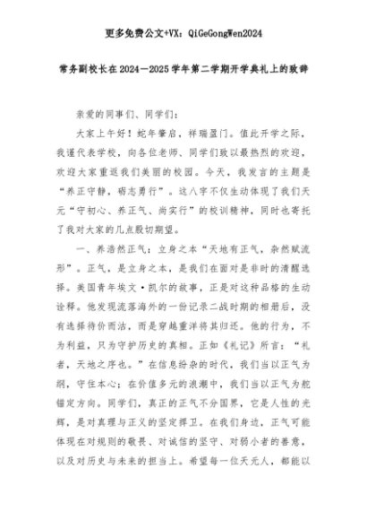 【七哥公文】2025年:常务副校长在2024-2025学年第二学期开学典礼上的致辞+更多免费公文+VX:QiGeGongWen2024+更多免费公文+VX:QiGeGongWen2024