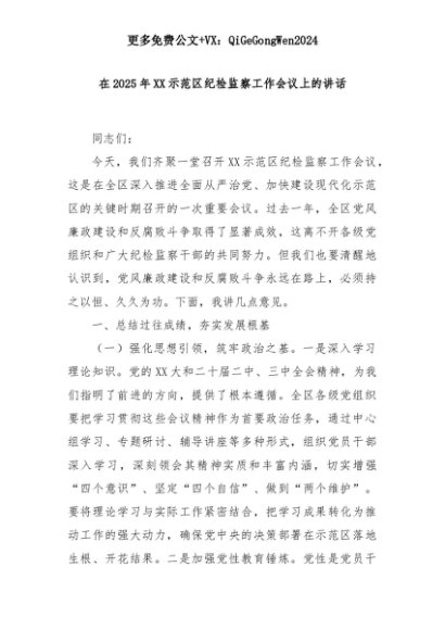 【七哥公文】2025年:在2025年XX示范区纪检监察工作会议上的讲话+更多免费公文+VX:QiGeGongWen2024+更多免费公文+VX:QiGeGongWen2024