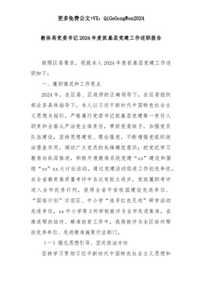 【七哥公文】2025年:教体局党委书记2024年度抓基层党建工作述职报告+更多免费公文+VX:QiGeGongWen2024+更多免费公文+VX:QiGeGongWen2024