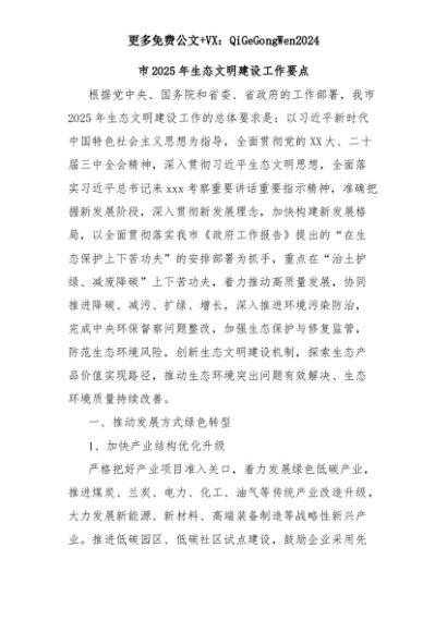 【七哥公文】2025年:市2025年生态文明建设工作要点+更多免费公文+VX:QiGeGongWen2024+更多免费公文+VX:QiGeGongWen2024