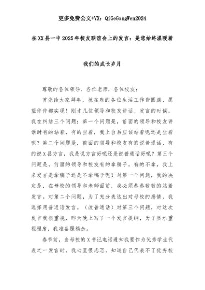 【七哥公文】2025年:在XX县一中2025年校友联谊会上的发言:是您始终温暖着我们的成长岁月+更多免费公文+VX:QiGeGongWen2024+更多免费公文+VX:QiGeGongWen2024