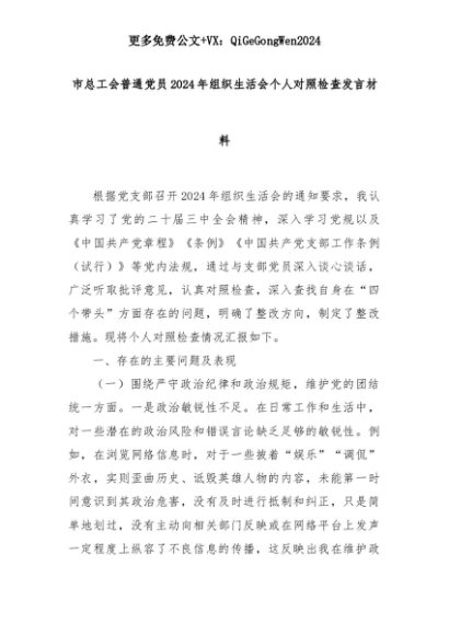 【七哥公文】2025年:市总工会普通党员2024年组织生活会个人对照检查发言材料+更多免费公文+VX:QiGeGongWen2024+更多免费公文+VX:QiGeGongWen2024