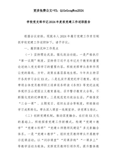 【七哥公文】2025年:学校党支部书记2024年度抓党建工作述职报告+更多免费公文+VX:QiGeGongWen2024+更多免费公文+VX:QiGeGongWen2024