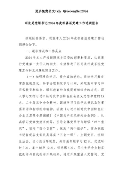 【七哥公文】2025年:司法局党组书记2024年度抓基层党建工作述职报告+更多免费公文+VX:QiGeGongWen2024+更多免费公文+VX:QiGeGongWen2024