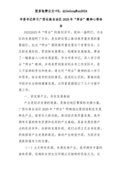 【七哥公文】2025年:市委书记学习广西壮族自治区2025年“两会”精神心得体会+更多免费公文+VX:QiGeGongWen2024+更多免费公文+VX:QiGeGongWen2024