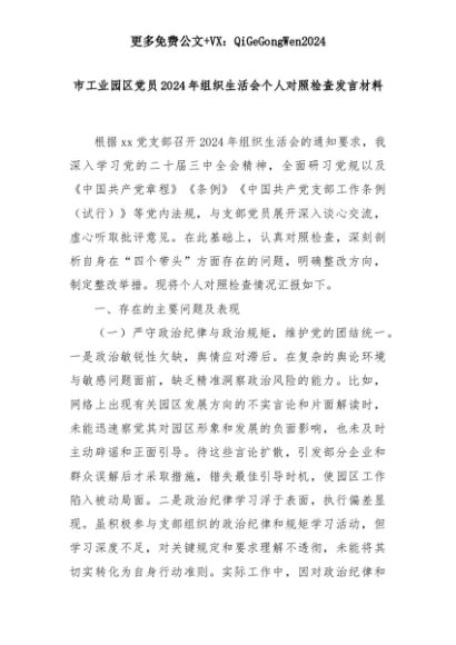 【七哥公文】2025年:市工业园区党员2024年组织生活会个人对照检查发言材料+更多免费公文+VX:QiGeGongWen2024+更多免费公文+VX:QiGeGongWen2024