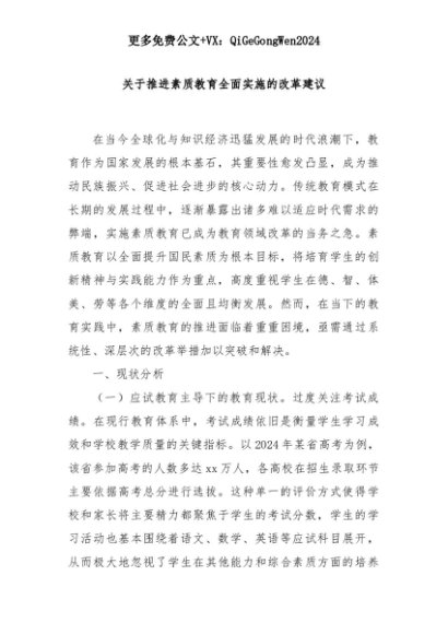 【七哥公文】2025年:关于推进素质教育全面实施的改革建议+更多免费公文+VX:QiGeGongWen2024+更多免费公文+VX:QiGeGongWen2024