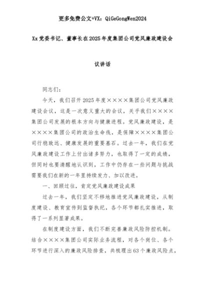 【七哥公文】2025年:Xx党委书记、董事长在2025年度集团公司党风廉政建设会议讲话+更多免费公文+VX:QiGeGongWen2024+更多免费公文+VX:QiGeGongWen2024