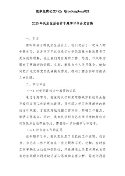 【七哥公文】2025年:2025年民主生活会前专题学习体会发言稿+更多免费公文+VX:QiGeGongWen2024+更多免费公文+VX:QiGeGongWen2024