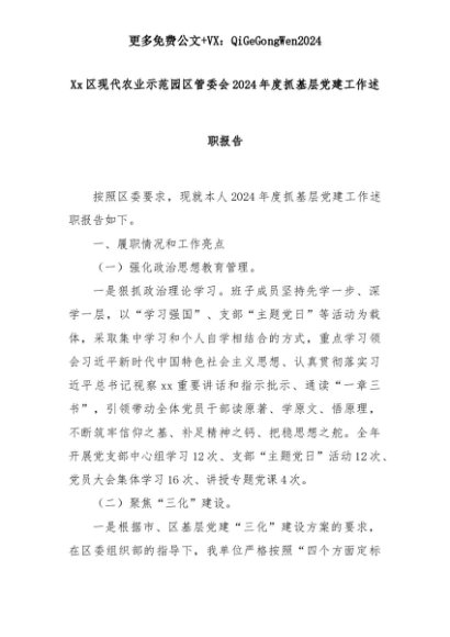 【七哥公文】2025年:Xx区现代农业示范园区管委会2024年度抓基层党建工作述职报告+更多免费公文+VX:QiGeGongWen2024+更多免费公文+VX:QiGeGongWen2024