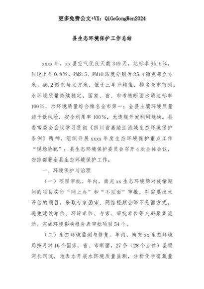 【七哥公文】2025年:县生态环境保护工作总结+更多免费公文+VX:QiGeGongWen2024+更多免费公文+VX:QiGeGongWen2024