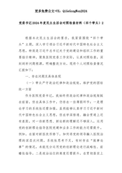 【七哥公文】2025年:党委书记2024年度民主生活会对照检查材料(四个带头)2+更多免费公文+VX:QiGeGongWen2024+更多免费公文+VX:QiGeGongWen2024