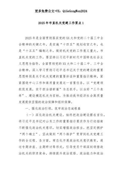 【七哥公文】2025年:2025年市直机关党建工作要点1+更多免费公文+VX:QiGeGongWen2024+更多免费公文+VX:QiGeGongWen2024