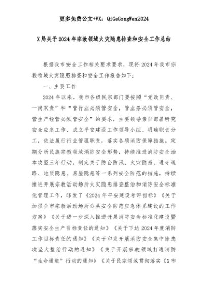 【七哥公文】2025年:X局关于2024年宗教领域火灾隐患排查和安全工作总结+更多免费公文+VX:QiGeGongWen2024+更多免费公文+VX:QiGeGongWen2024