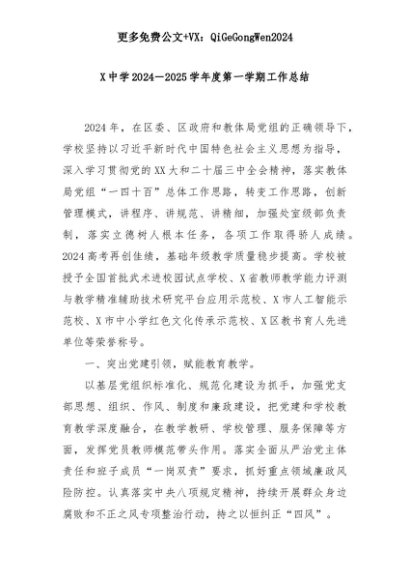【七哥公文】2025年:X中学2024-2025学年度第一学期工作总结+更多免费公文+VX:QiGeGongWen2024+更多免费公文+VX:QiGeGongWen2024