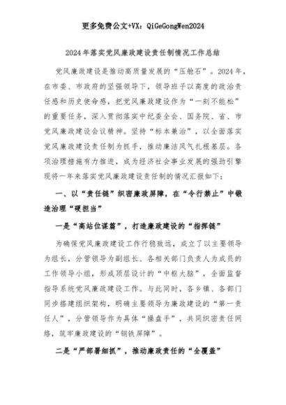 【七哥公文】2025年:2024年落实党风廉政建设责任制情况工作总结+更多免费公文+VX:QiGeGongWen2024+更多免费公文+VX:QiGeGongWen2024