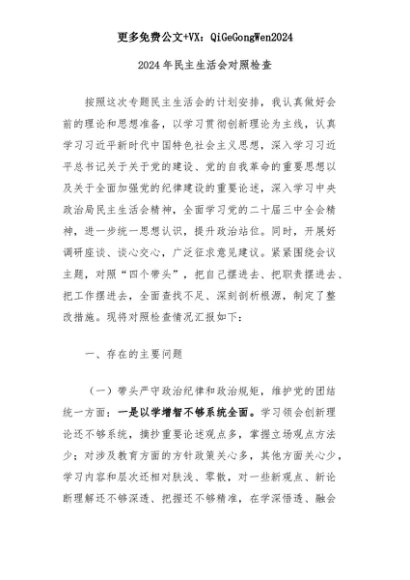 【七哥公文】2025年:2024年民主生活会对照检查+更多免费公文+VX:QiGeGongWen2024+更多免费公文+VX:QiGeGongWen2024