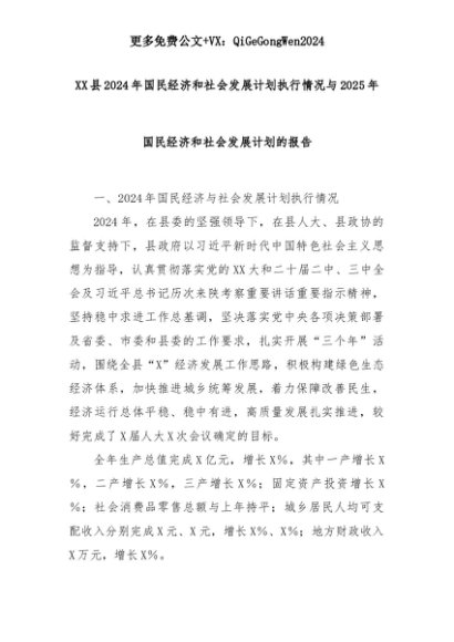 【七哥公文】2025年:XX县2024年国民经济和社会发展计划执行情况与2025年国民经济和社会发展计划的报告+更多免费公文+VX:QiGeGongWen2024+更多免费公文+VX:QiGeGongWen2024