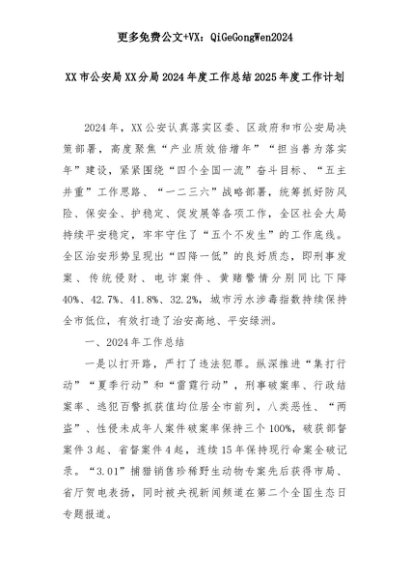【七哥公文】2025年:XX市公安局XX分局2024年度工作总结2025年度工作计划+更多免费公文+VX:QiGeGongWen2024+更多免费公文+VX:QiGeGongWen2024