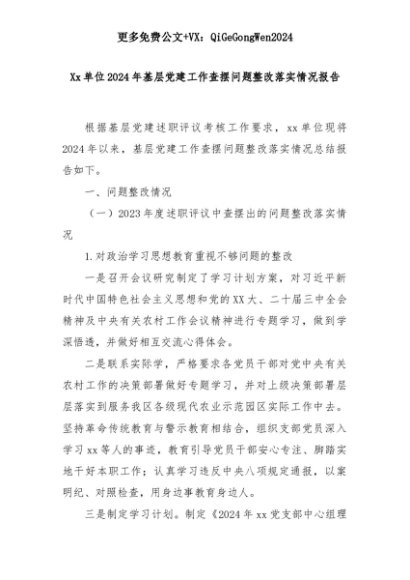 【七哥公文】2025年:Xx单位2024年基层党建工作查摆问题整改落实情况报告+更多免费公文+VX:QiGeGongWen2024+更多免费公文+VX:QiGeGongWen2024