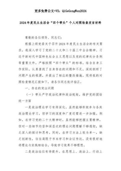 【七哥公文】2025年:2024年度民主生活会“四个带头”个人对照检查发言材料+更多免费公文+VX:QiGeGongWen2024+更多免费公文+VX:QiGeGongWen2024