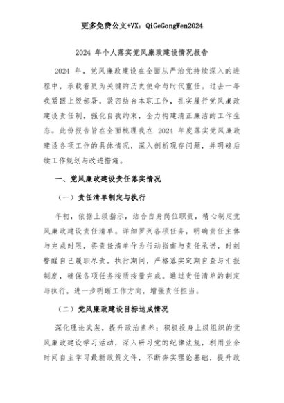 【七哥公文】2025年:2024 年个人落实党风廉政建设情况报告+更多免费公文+VX:QiGeGongWen2024+更多免费公文+VX:QiGeGongWen2024