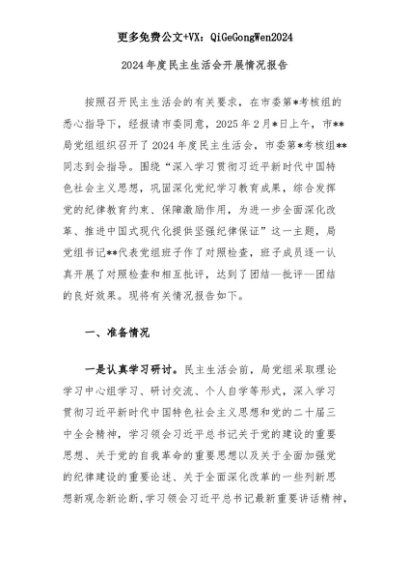 【七哥公文】2025年:2024年度民主生活会开展情况报告+更多免费公文+VX:QiGeGongWen2024+更多免费公文+VX:QiGeGongWen2024