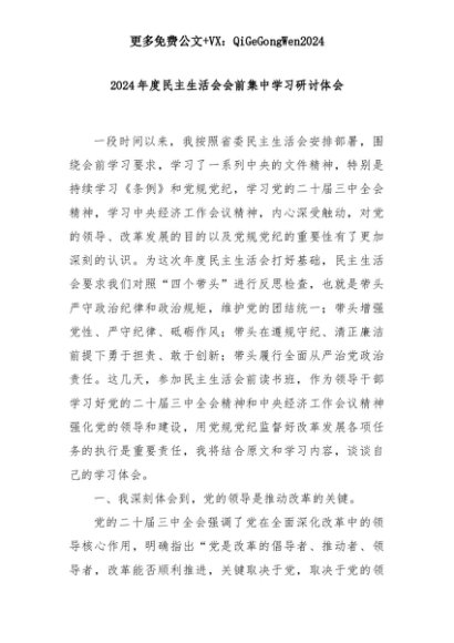 【七哥公文】2025年:2024年度民主生活会会前集中学习研讨体会+更多免费公文+VX:QiGeGongWen2024+更多免费公文+VX:QiGeGongWen2024