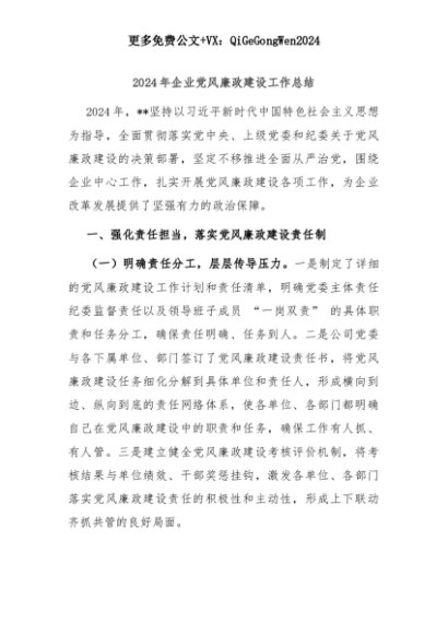 【七哥公文】2025年:2024年企业党风廉政建设工作总结+更多免费公文+VX:QiGeGongWen2024+更多免费公文+VX:QiGeGongWen2024
