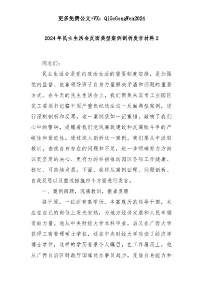 【七哥公文】2025年:2024年民主生活会反面典型案例剖析发言材料2+更多免费公文+VX:QiGeGongWen2024+更多免费公文+VX:QiGeGongWen2024