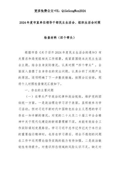 【七哥公文】2025年:2024年度市直单位领导干部民主生活会、组织生活会对照检查材料(四个带头)+更多免费公文+VX:QiGeGongWen2024+更多免费公文+VX:QiGeGongWen2024