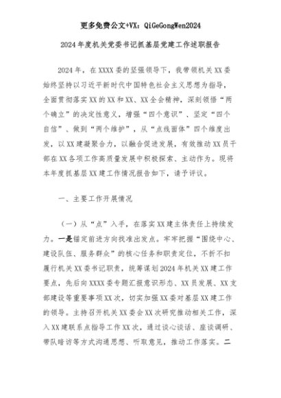 【七哥公文】2025年:2024年度机关党委书记抓基层党建工作述职报告+更多免费公文+VX:QiGeGongWen2024+更多免费公文+VX:QiGeGongWen2024