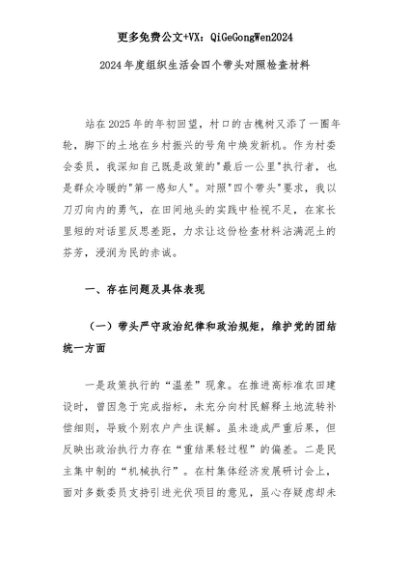 【七哥公文】2025年:2024年度组织生活会四个带头对照检查材料+更多免费公文+VX:QiGeGongWen2024+更多免费公文+VX:QiGeGongWen2024