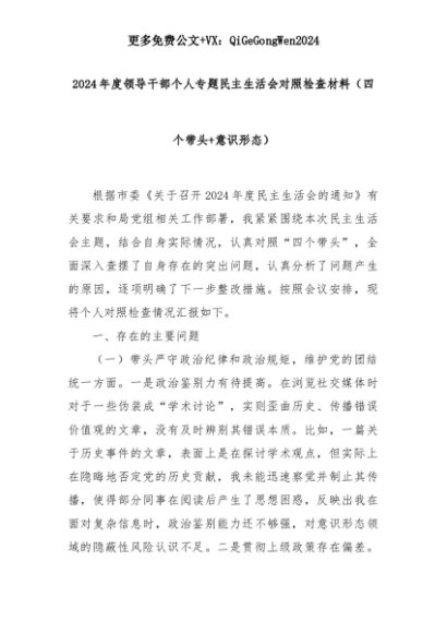 【七哥公文】2025年:2024年度领导干部个人专题民主生活会对照检查材料(四个带头+意识形态)+更多免费公文+VX:QiGeGongWen2024+更多免费公文+VX:QiGeGongWen2024