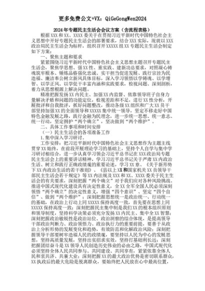 【七哥公文】2025年:2024年专题民主生活会会议方案(含流程表格)+更多免费公文+VX:QiGeGongWen2024+更多免费公文+VX:QiGeGongWen2024