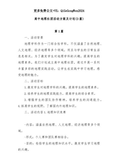 【七哥公文】2025年:(3篇)高中地理社团活动方案及计划+更多免费公文+VX:QiGeGongWen2024+更多免费公文+VX:QiGeGongWen2024
