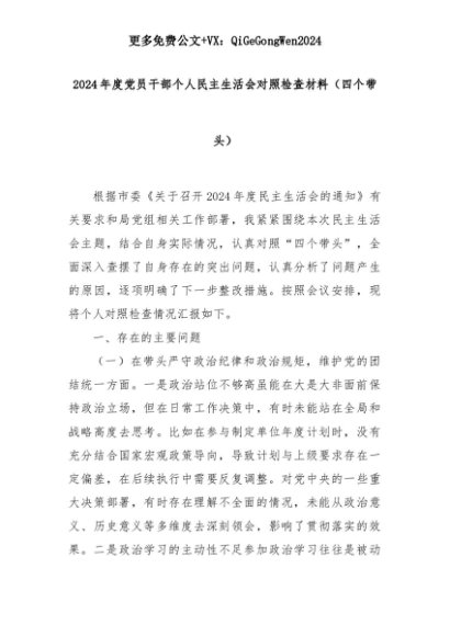 【七哥公文】2025年:2024年度党员干部个人民主生活会对照检查材料(四个带头)+更多免费公文+VX:QiGeGongWen2024+更多免费公文+VX:QiGeGongWen2024