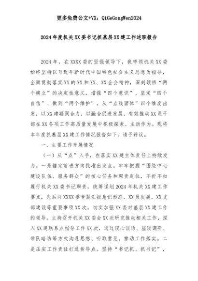 【七哥公文】2025年:2024年度机关XX委书记抓基层XX建工作述职报告+更多免费公文+VX:QiGeGongWen2024+更多免费公文+VX:QiGeGongWen2024