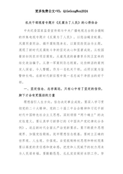 【七哥公文】2025年:机关干部观看专题片《反腐为了人民》的心得体会+更多免费公文+VX:QiGeGongWen2024+更多免费公文+VX:QiGeGongWen2024
