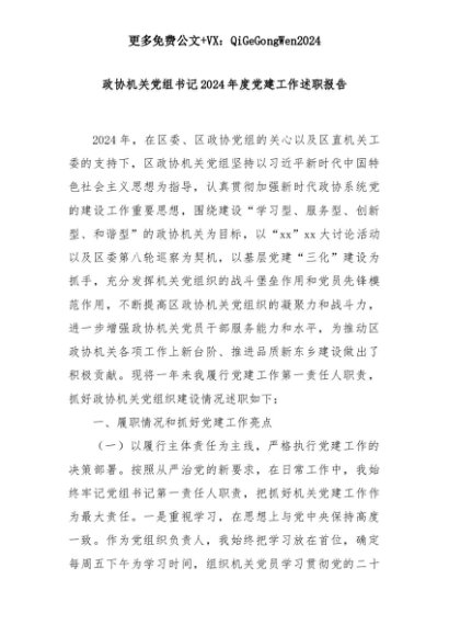 【七哥公文】2025年:政协机关党组书记2024年度党建工作述职报告+更多免费公文+VX:QiGeGongWen2024+更多免费公文+VX:QiGeGongWen2024