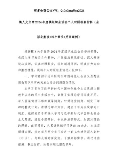 【七哥公文】2025年:镇人大主席2024年度镇组织生活会个人对照检查材料(生活会整改+四个带头+反面案例)+更多免费公文+VX:QiGeGongWen2024+更多免费公文+VX:QiGeGongWen2024