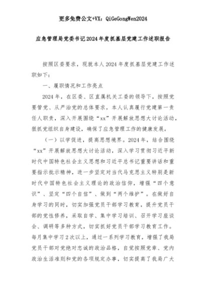 【七哥公文】2025年:应急管理局党委书记2024年度抓基层党建工作述职报告+更多免费公文+VX:QiGeGongWen2024+更多免费公文+VX:QiGeGongWen2024