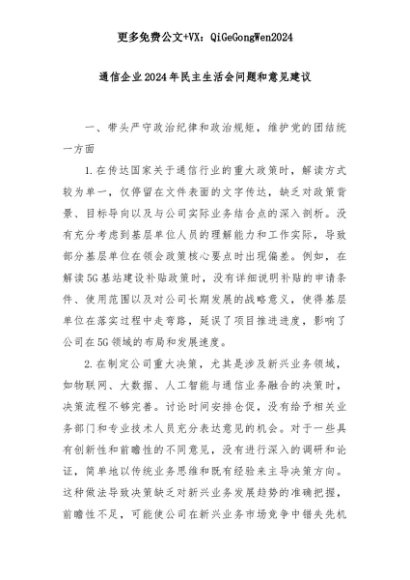 【七哥公文】2025年:通信企业2024年民主生活会问题和意见建议+更多免费公文+VX:QiGeGongWen2024+更多免费公文+VX:QiGeGongWen2024