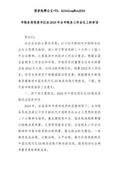 【七哥公文】2025年:市税务局党委书记在2025年全市税务工作会议上的讲话+更多免费公文+VX:QiGeGongWen2024+更多免费公文+VX:QiGeGongWen2024