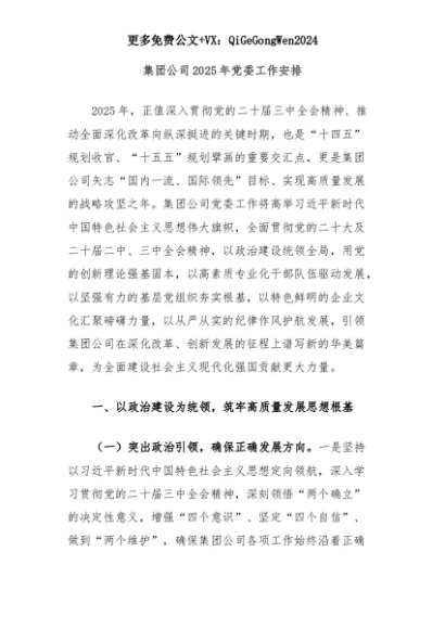 【七哥公文】2025年:集团公司2025年党委工作安排+更多免费公文+VX:QiGeGongWen2024+更多免费公文+VX:QiGeGongWen2024