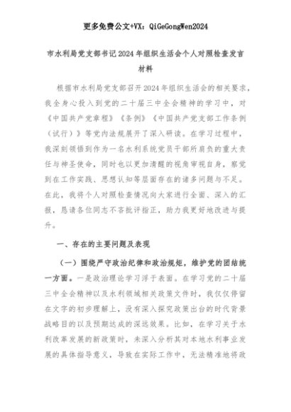 【七哥公文】2025年:市水利局党支部书记2024年组织生活会个人对照检查发言材料+更多免费公文+VX:QiGeGongWen2024+更多免费公文+VX:QiGeGongWen2024