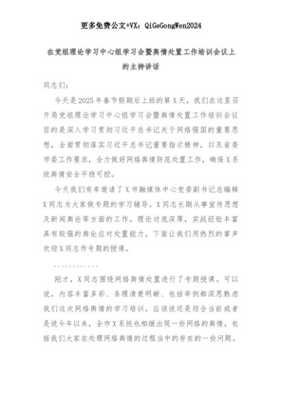 【七哥公文】2025年:在党组理论学习中心组学习会暨舆情处置工作培训会议上的主持讲话+更多免费公文+VX:QiGeGongWen2024+更多免费公文+VX:QiGeGongWen2024
