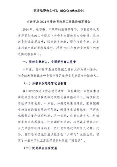 【七哥公文】2025年:市教育局2024年度教育改革工作推进情况报告+更多免费公文+VX:QiGeGongWen2024+更多免费公文+VX:QiGeGongWen2024